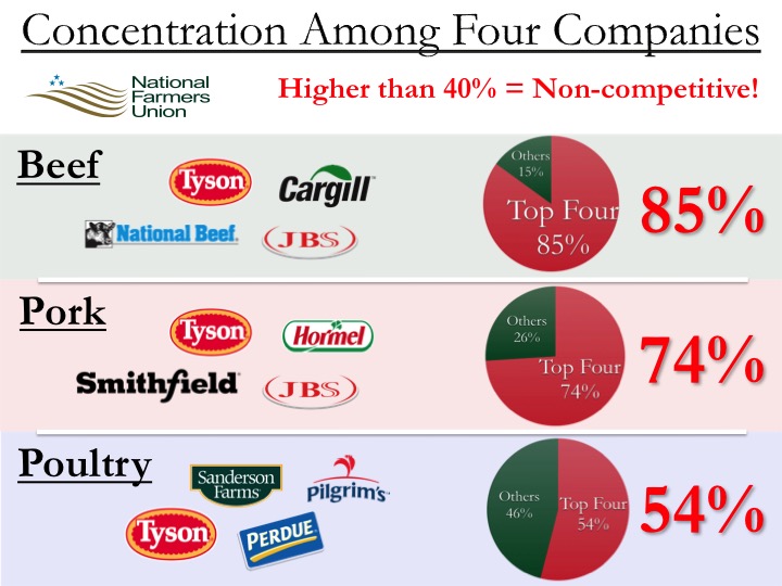 Markets are considered non-competitive when just a few companies control more than 40% of the market share. Concentration among the top four companies in the beef, pork and poultry industries are currently 85%, 74%, and 54%, respectively. This consolidation has given these large companies near-limitless power when dealing with individual producers, who consequently have almost no control over the prices they are paid or the way in which they raise their animals. Unfortunately for producers, the “unfair practices and undue preferences” prohibited by the Packers and Stockyards Act were never defined, thus leaving the act open to interpretation; these interpretations have generally favored the interests of multinational meatpackers over those of individual producers.